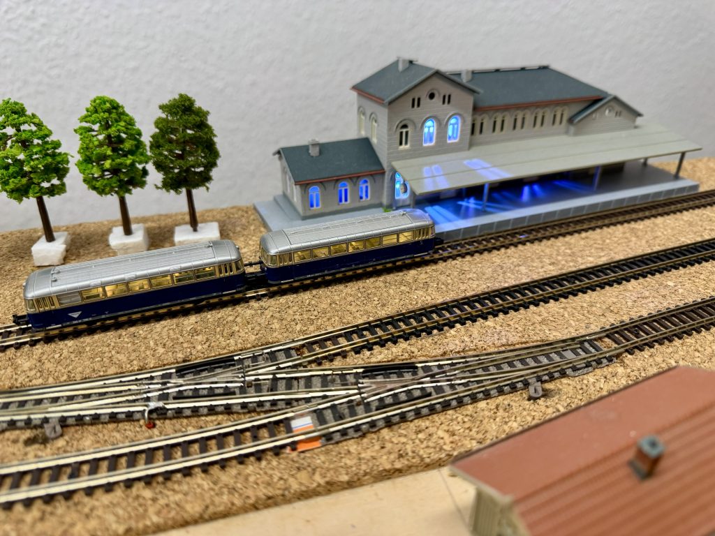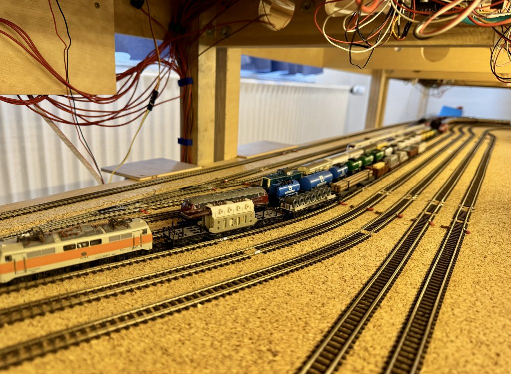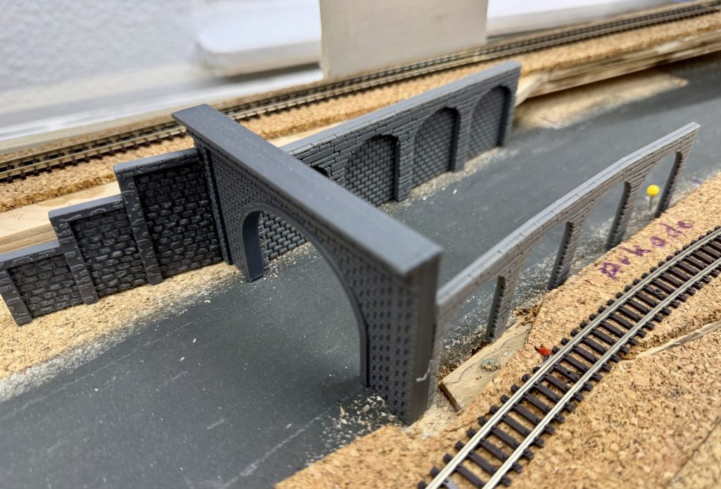 Überarbeitung der Schattenbahnhofsgleise, Überarbeitung des N Bahn Car Systems, kleine erste landschaftliche Stellproben, Einbau der im 3 D Drucker entstandenen Brücken und Tunnelportale und zu den Baustellenfahrtagen die Eröffnung eines weiteren Anlagenteils. Der mittlere Verbindungsteil zwischen dem rechten und dem zukünftigen entstehenden linken Anlagenteil wurde zum Baustellentag in Betrieb genommen.